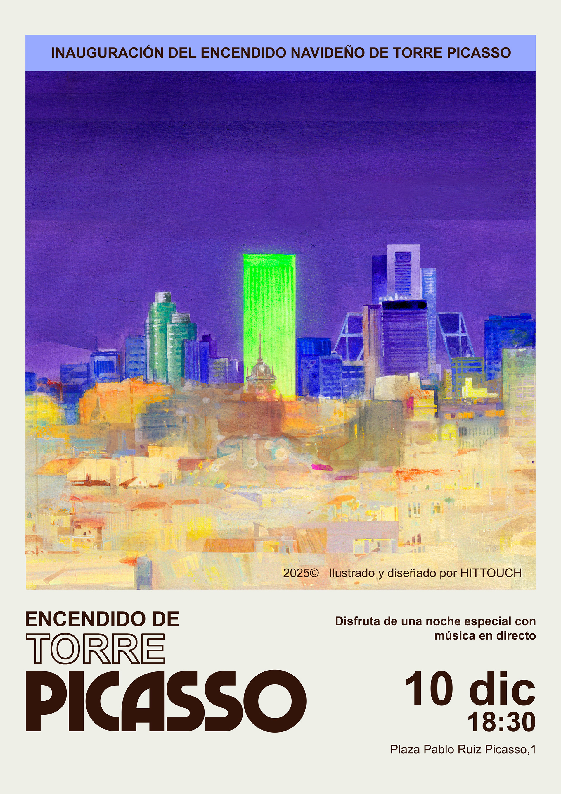 Póster informativo para el evento del encendido navideño de la torre Picasso 2023